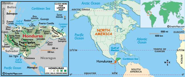 洪都拉斯共和国位于中美洲,与危地马拉、萨尔瓦多和尼加拉瓜接壤. 它在太平洋和加勒比海有海岸线. 面积约11万平方公里,人口7百50万左右.